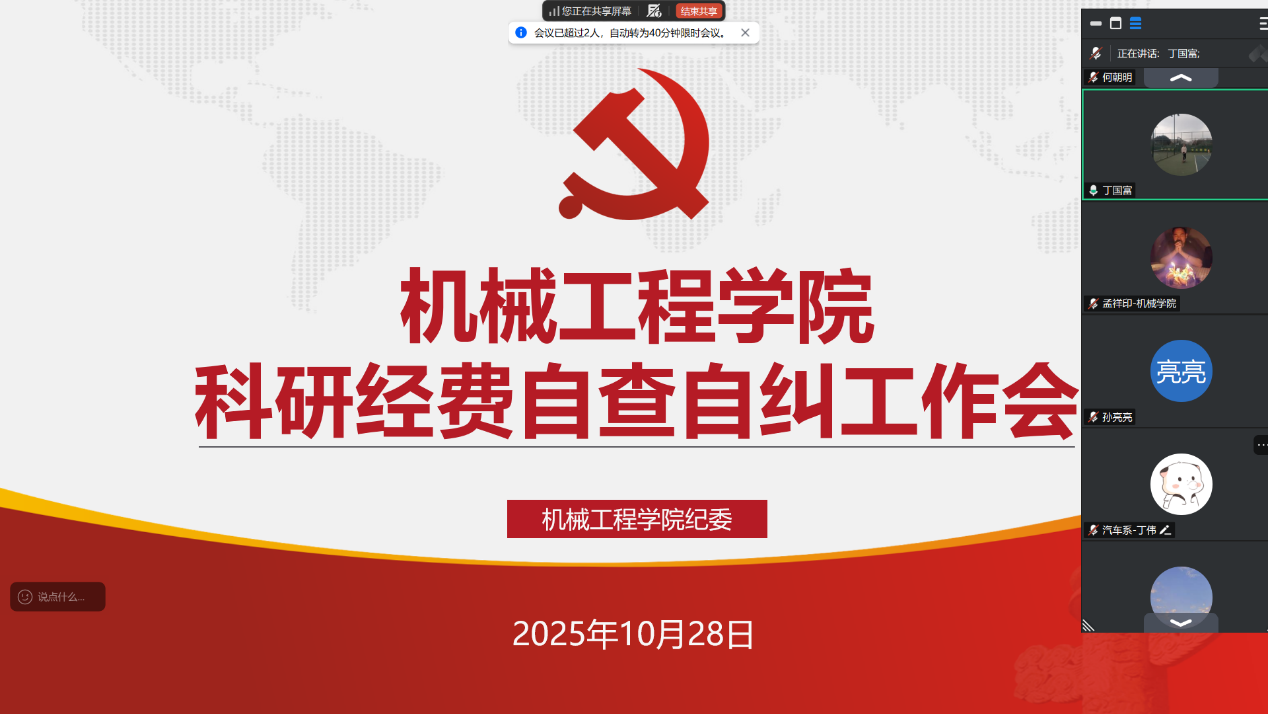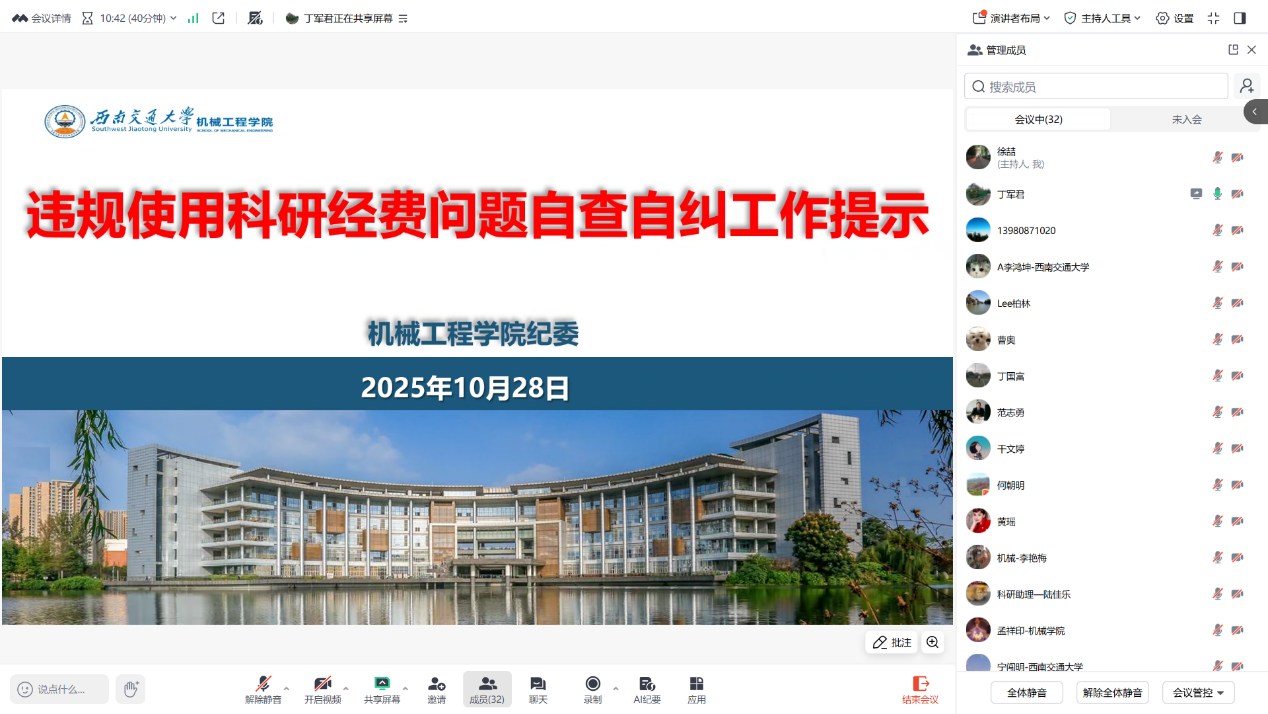 丁军君传达了上级部门关于科研经费管理的最新政策文件精神,明确了此次自查自纠工作的范围和内容,重点围绕科研项目经费使用的关键环节进行全面排查。同时结合高校科研经费违规违纪典型案例,剖析了经费使用中常见问题的表现形式及纪法后果。