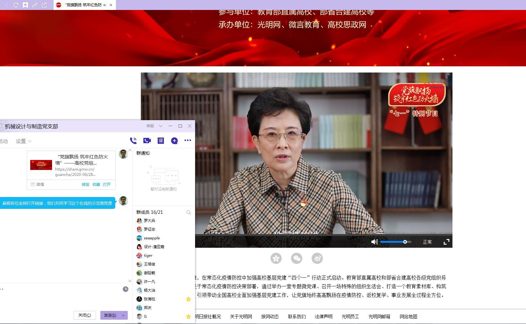 建党99周年来临之际,机械设计与制造党支部专门召开“迎党的生日、讲战疫故事、悟初心使命” 专题组织生活会,组织全体党员观看战“疫”示范微党课,宣传学习抗疫一线基层党组织和广大党员的先进事迹,鼓舞大家学习先进典型,争当先锋党员。本次组织生活会采用网络线上的方式进行。