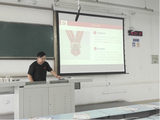 活动开始之际,艾子涵同志向师生们介绍了“七一勋章”的组成和地位:“它是最美的勋章!它是信仰的力量!”“七一勋章”由党徽、五角星、旗帜等元素组成,是党内的最高荣誉,它寓意着在党的阳光沐浴下,勋章获得者一心向党,全心全意为人民服务,不忘初心、牢记使命、砥砺前行。