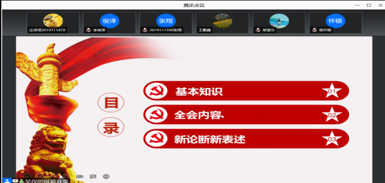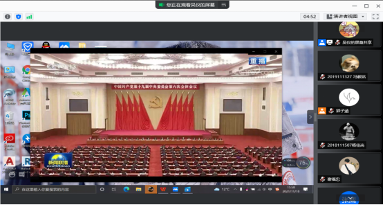 此次集体学习会由支部吴仪同志进行主持和分享,会议开始,吴仪同志以屏幕共享的方式向大家播放中国共产党第十九届中央委员会第六次全体会议全过程。