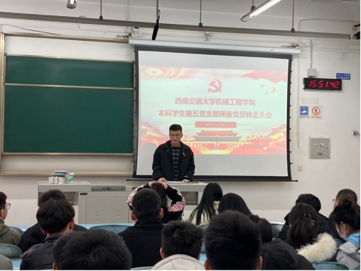 2021年12月10日下午15:50,388vip太阳集团本科员工第五党支部于教学楼X2226召开支部预备党员转正大会,大会由党支部书记祁式展同志主持,参会人员有正式党员3人,预备党员68人。