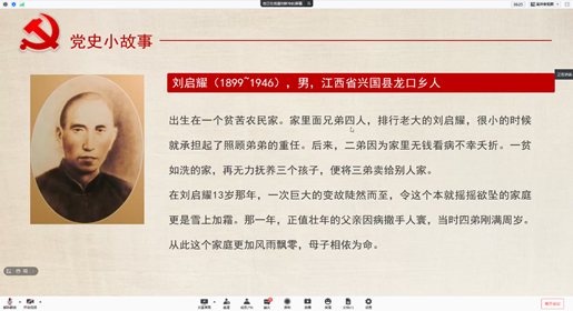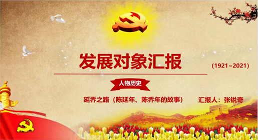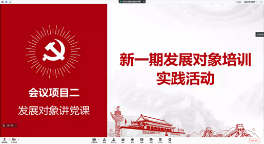 孙舰凯同志主持开展了发展对象培训实践活动,本次实践活动以“发展对象讲党课”的形式开展,本次进行学习分享的发展对象如下:曹洋、邓越、何屹辰、寇皓为、赖焕杰、李林峰、李召鑫、张锐奇。各位发展对象分别针对党史的各个方面进行陈述,发表了自己在学习党史过程的一些感悟和思考,通过图片和视频等多种形式的展示,生动地为全体与会成员讲述了中国共产党在百年征程中感人肺腑的故事。