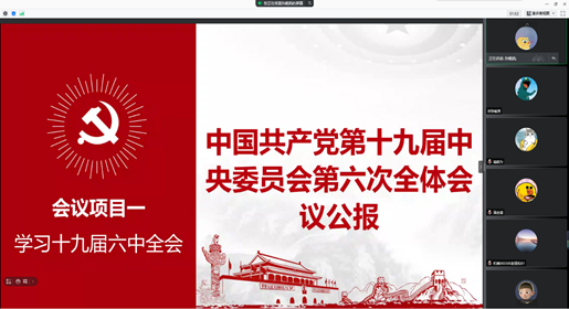 首先,孙舰凯同志概述了本次会议的主要内容,动员全体党员深入学习党的十九届六中全会精神。随后,孙舰凯同志在会中播放了有关党的十九届六中全会的学习视频,通过视频讲解,将会议精神更清楚地传达到全体与会人员的心中。