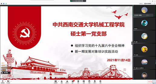 2021年11月14日,388vip太阳集团硕士第一党支部组织全体党员开展党支部会议,本次会议线上进行,本次会议参与人数共80余人,包括全体支部党员、全体入党积极分子以及发展对象。会议内容包括两项:组织全体党员学习党的十九届六中全会精神以及新一期发展对象培训实践活动,本次会议由孙舰凯同志主持。
