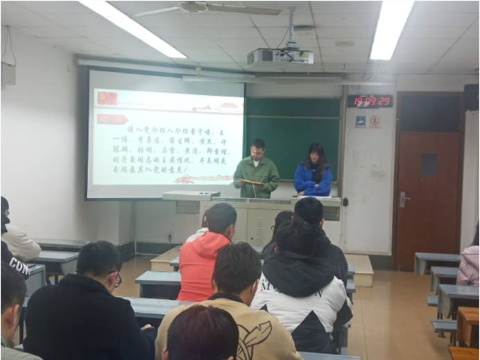 首先进行会议第一项议程,由曹宇啸、王一博、李勇洁、蒋生辉等同志一一汇报对党的认识、入党动机、本人履历、家庭成员和主要社会关系情况、现实表现,以及需要向党组织说明的其他问题。其中曹宇啸同志汇报说自己受亲人和同学中的党员同志影响,党员的先锋模范现象一直深入其心,故自己虽不是党员,却一直怀有一颗真诚入党的心;李勇洁同志生活中时刻帮助有困难的同学;黄杰同志学习上努力刻苦,积极向党组织靠拢;黄涛同志身为班级团支部书记,对班级事务认真负责,获得同学一致认可,希望加入敬爱的党组织,为党和国家的建设,贡献自己的力量。