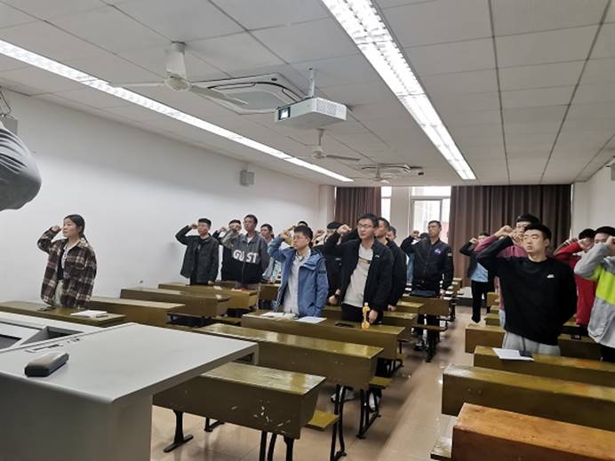 随后,在梁晨昊同志的带领下,党支部全体起立开展此次活动第三项内容——庄严宣誓,全体党员均举起右拳诵读誓词,表达强国有我,请党放心的决心。