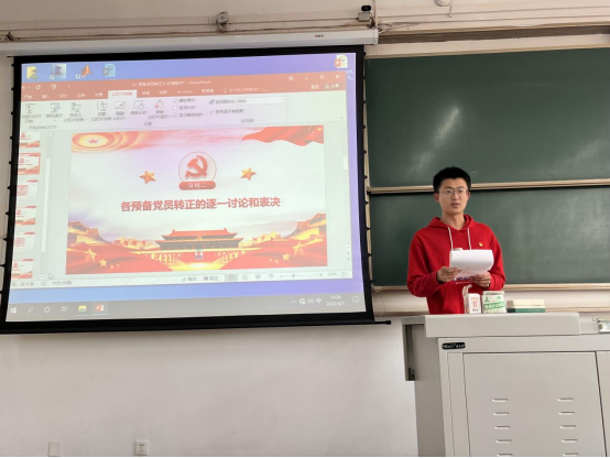会议开始,由主持人介绍当天的参会情况与会议流程等。首先由党支部书记贾西贝同志宣布本次会议的预备党员转正人员名单,接着薛盛中、唐晓宇同志等18名预备党员逐一宣读转正申请书,汇报自己一年预备期中在思想、学习、生活中的表现、主要优缺点、今后努力方向,以及需向党组织说清楚的问题。