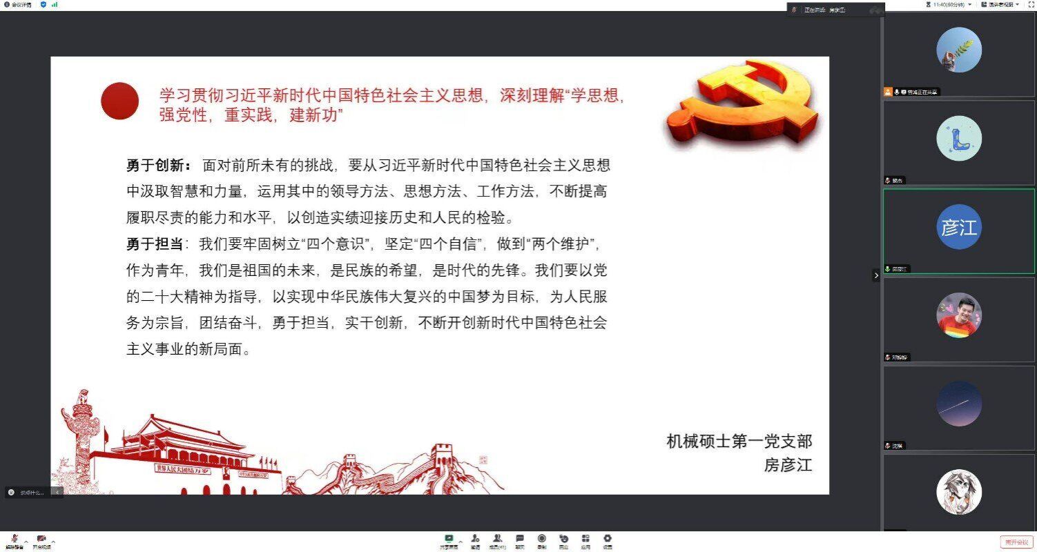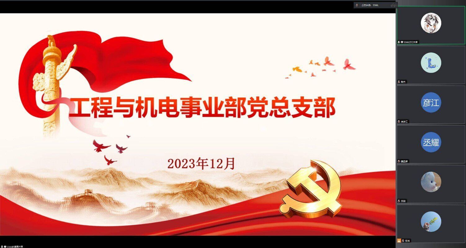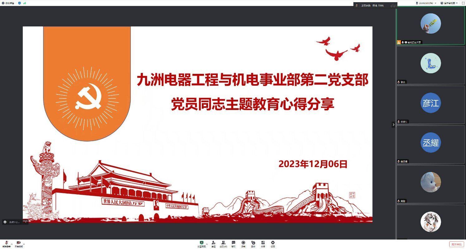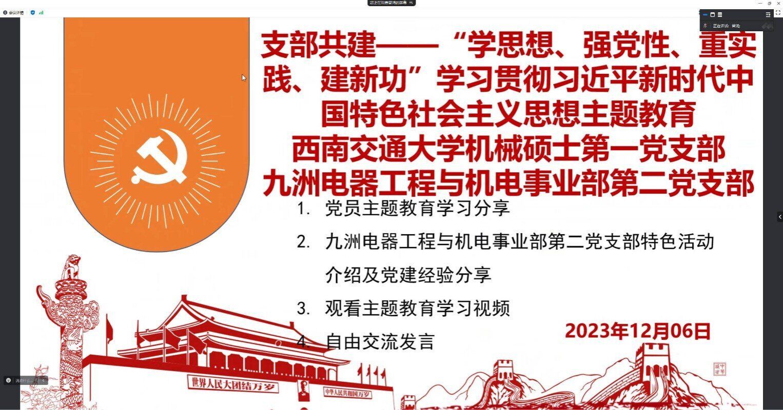 2023年12月6日,388vip太阳集团硕士第一党支部在线上与九洲电器工程与机电事业部第二党支部共同举行主题教育活动——“学思想、强党性、重实践、建新功”学习贯彻习近平新时代中国特色社会主义思想。活动内容共三项:第一项:党员主题教育学习分享。第二项:九洲电器工程与机电事业部第二党支部特色活动介绍及党建经验分享。第三项:观看主题教育学习视频。本次会议由曾鸿同志主持。