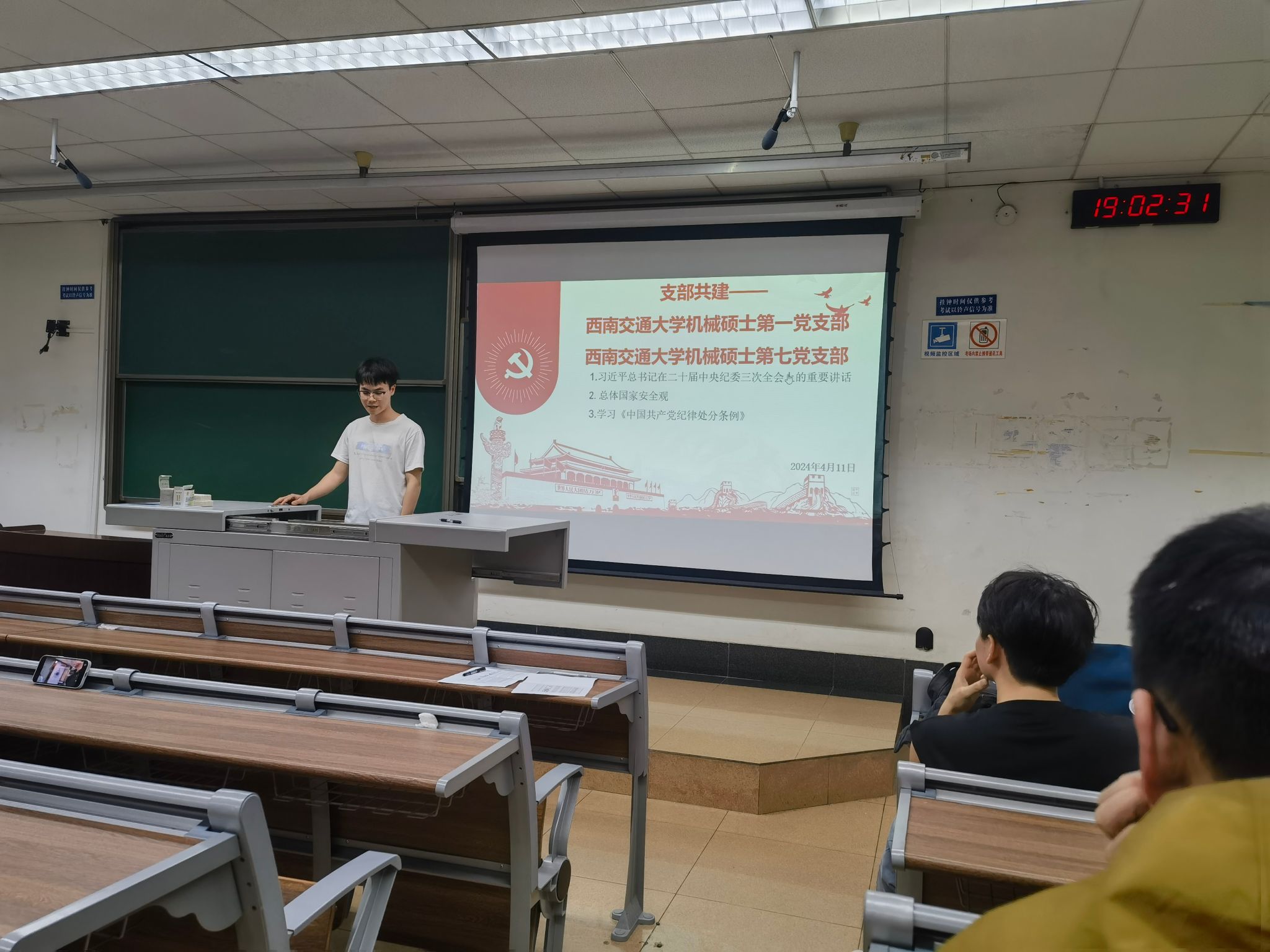 2024年4月11日,388vip太阳集团硕士第一党支部与第七党支部在九里校区4号教学楼J4310进行支部共建交流学习。活动内容共三项:第一项:学习习近平总书记在二十届中央纪委三次全会上的重要讲话;第二项:学习总体国家安全观;第三项:学习《中国共产党纪律处分条例》。本次会议由曾鸿同志主持。