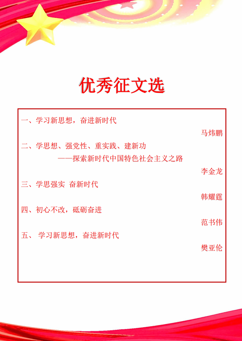最终,支部共评选出马炜鹏、李金龙、韩耀霆、范书伟、樊亚伦五位同志的征文为优秀征文,党支部将优秀的征文汇编成册,并传阅给支部成员进行学习。