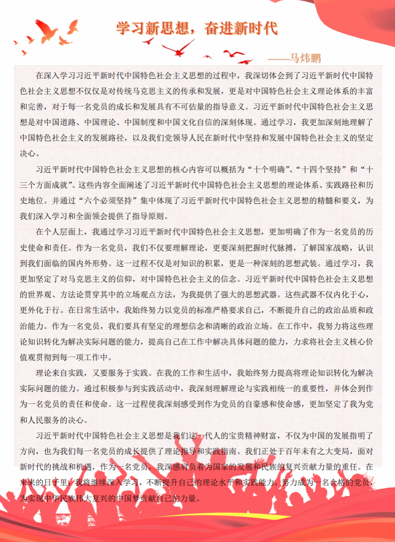 在本次主题征文活动,全体党员及积极分子不仅理论水平和党性修养得到了进一步提升,而且对习近平新时代中国特色社会主义思想的内涵有了更深刻的理解。大家在学习过程中,积极思考,勇于实践,将理论学习与实际工作相结合,以党的创新理论为指导,推动工作创新发展。通过本次活动,有力地促进了党支部的团结和协作,增强了党支部的凝聚力和战斗力。大家在学习中相互交流、相互借鉴,形成了良好的学习氛围,为党支部的各项工作提供了有力的思想保障。