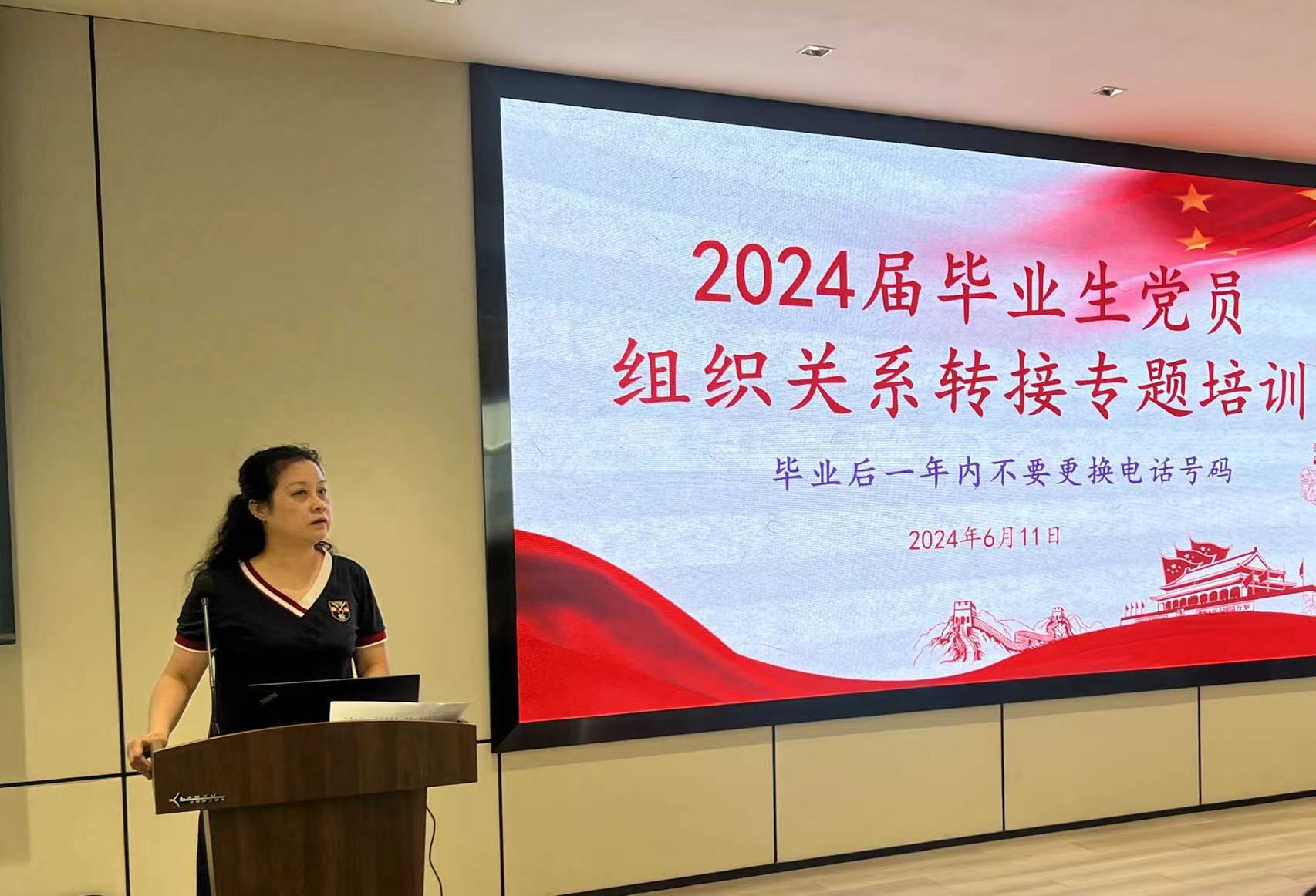接着,梁艳老师在会上详细解释了党组织关系转接的重要性和操作流程,要求毕业生党员充分认识到党组织在实现自身职业发展与社会服务中的重要作用,并妥善完成党组织关系的转接工作。她强调,在毕业前后,党员同志们要确保党组织关系顺利接续,确保在新的工作岗位上继续保持党员的先进性和纯洁性。