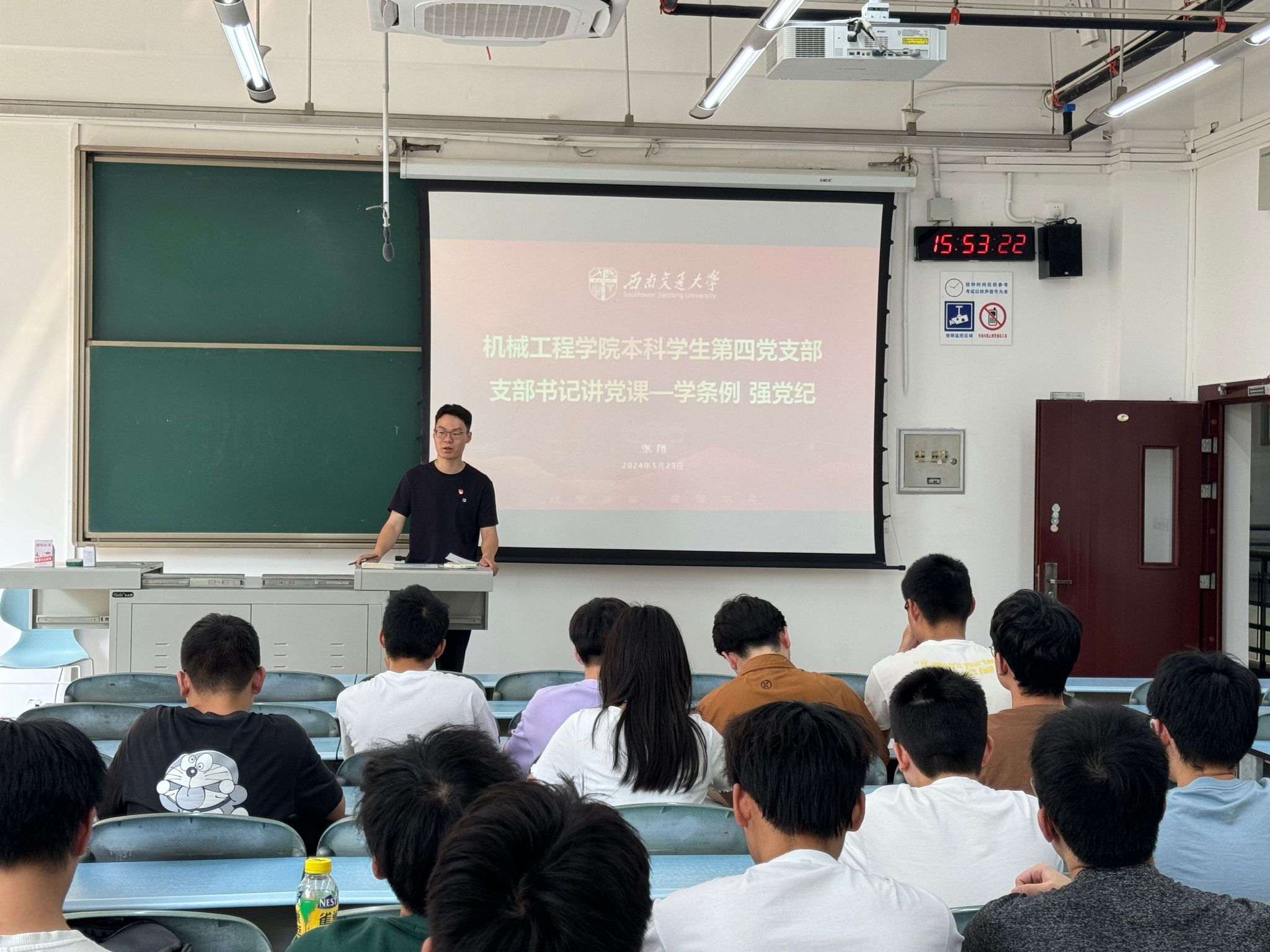 为深入学习贯彻习近平总书记关于党的自我革命的重要思想,扎实开展党纪学习教育,根据公司党委的统一要求,5月23日,本科员工第四党支部举行了“支部书记讲党课”活动,支部书记、公司青年讲师团成员张翔老师以“学条例,强党纪”为主题,为支部全体党员讲授了一堂纪律党课。