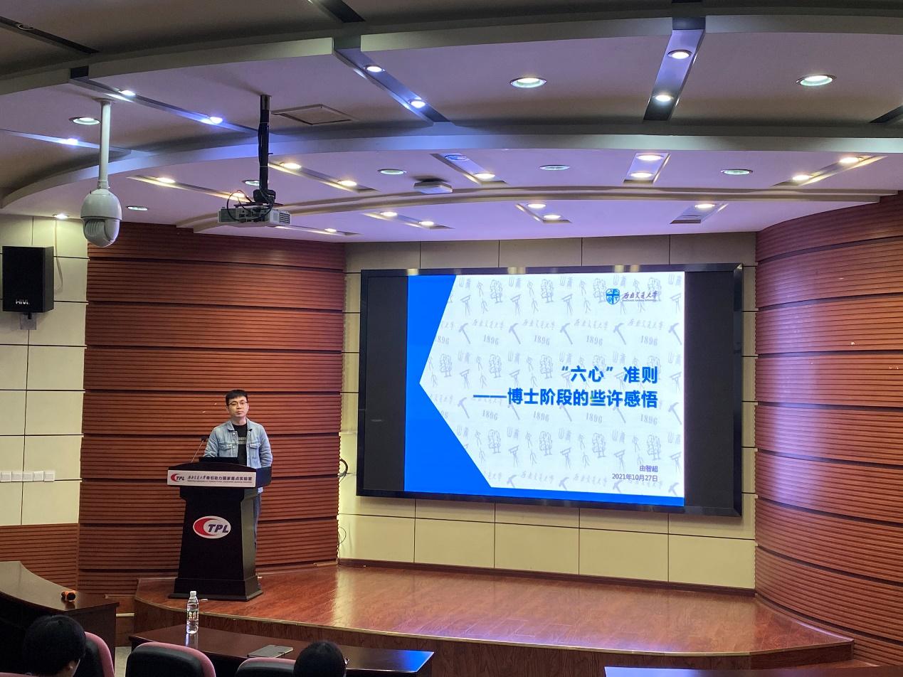 活动第二部分,由智超博士以《“六心准则”——博士阶段的些许感悟》为题做了科研经验分享,以切实而生动的语言讲述了自己的科研求学路,鼓励师弟师妹们勇于探索,开启自己人生新篇章。