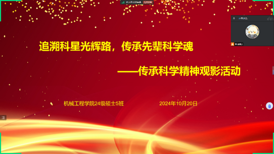 为积极弘扬科学精神,2024级硕士5班于2024年10月20日举办了一场以“追溯科星光辉路,传承先辈科学魂”为主题的线上观影活动。此次活动旨在引导青年员工学习老一辈科学家的崇高精神,激励同学们传承和弘扬科学精神,全班同学积极参与,取得了良好的育人实效。