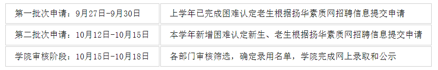 2.2022级新生及本学年新增家庭经济困难老生的勤工助学岗位招聘将在公司困难认定结果出来后进行,参考招聘流程第二批次申请时间。