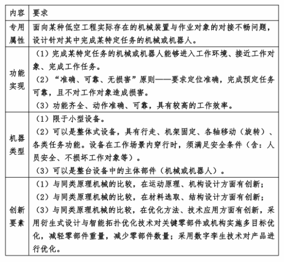 内容:用于 120 米以下低空保障、低空服务,聚焦基础设施维护,安全应急救援,针对工作目标及任务完成飞行运动提升、空中作业平台建立、机器人操作及其协同控制策略。设计内容可以是光伏面板、风电叶片清洗、高层建筑灭火救援、空中清洁、空中电力设备设施检修、空中采摘(苹果、草药)等各类空中作业平台或机器人,该系统的无人机部分不作为设计重点,设计中可提供选型。
