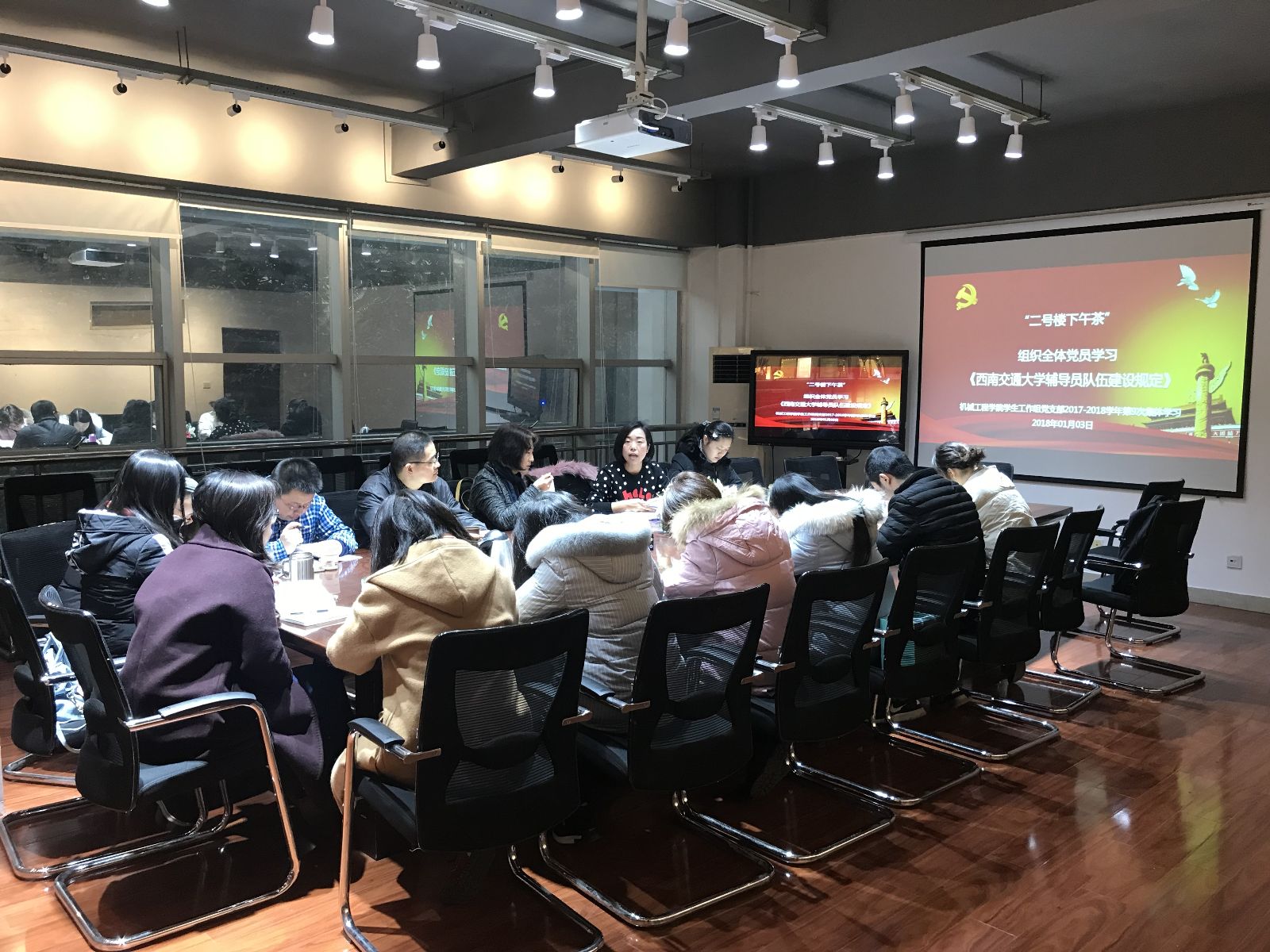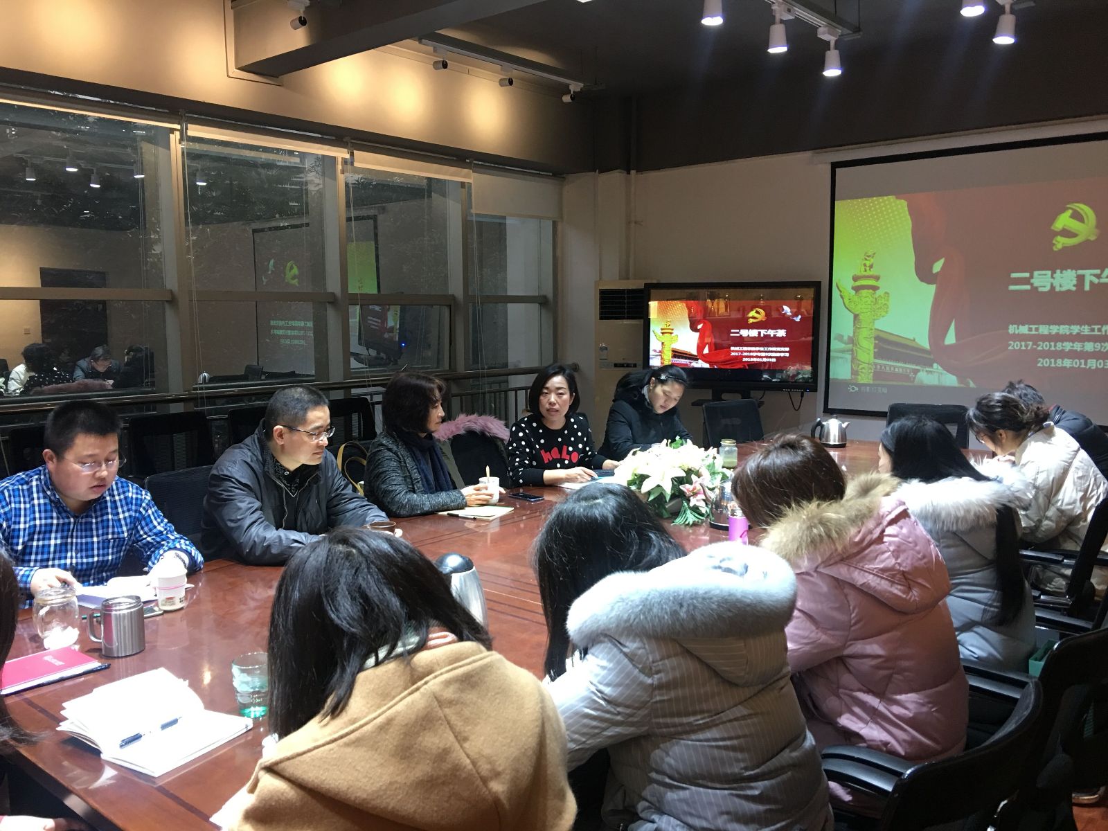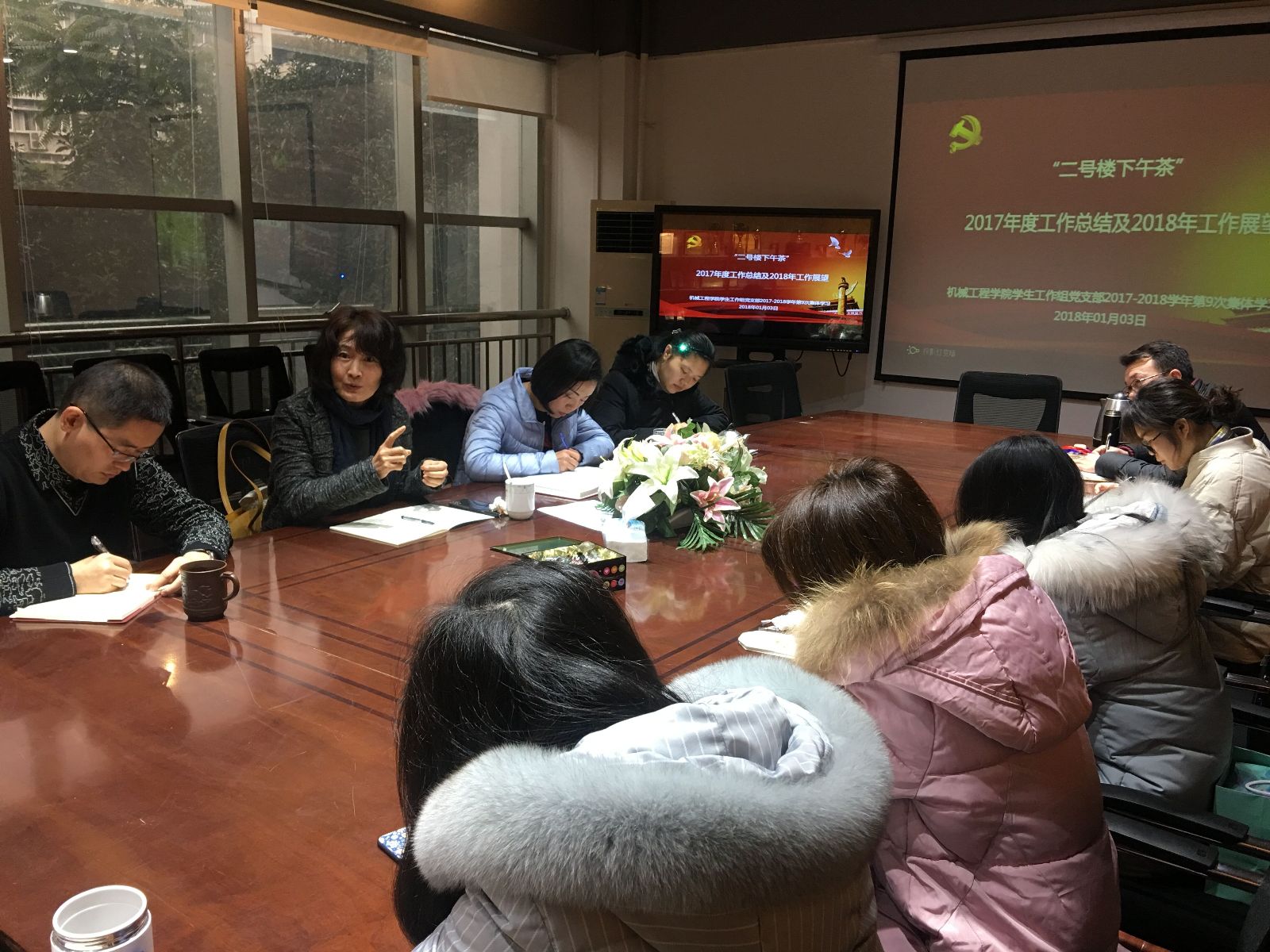 2018年1月3日,388vip太阳集团员工工作在X2201召开2018年第一次“二号楼下午茶”组织生活会,公司党委书记战凤同志、党委副书记李毅同志、全体专、兼职辅导员参会。组织生活会分为两个部分,首先是全体与会成员学习了《388vip太阳集团辅导员队伍建设规定》,第二个部分是全体成员通自我批评和提意见的方式对2017年的工作进行了总结梳理,对2018年工作进行了规划和思考。