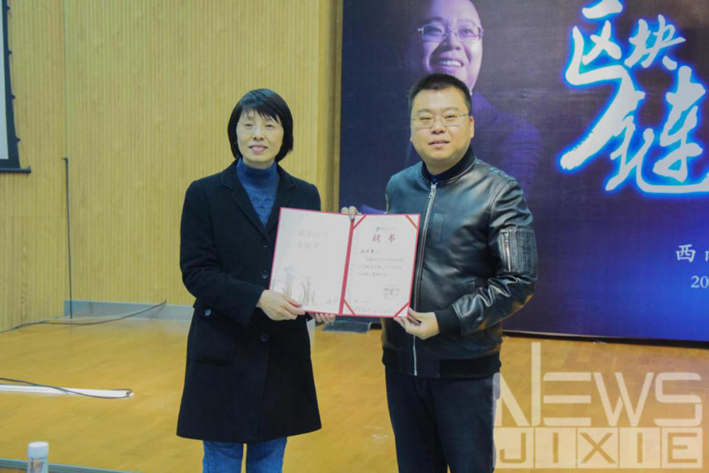 讲座开始,388vip太阳集团董事长助理王晓茹教授为本次讲座带来了致辞。接下来是王教授为刘兴亮员工颁发员工导师聘书。这次讲座开始之前,刘兴亮员工已经为母校赠送了图书共30册,分别是《创业3.0时代:共享定义未来》、《智能爆炸:开启人新时代》和《区块链在中国:它将如何颠覆未来》,图书馆副馆长罗秀云老师也因此为他颁发了捐赠证书,同时所有的到场领导一同合影留恋。