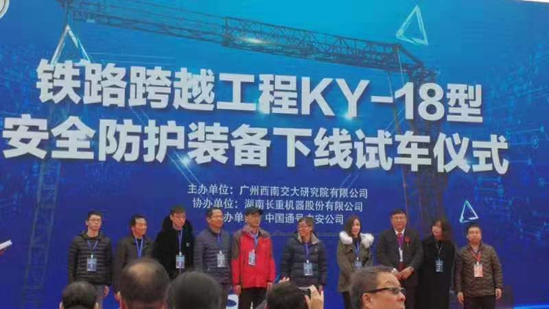 由广州西南交大研究院有限公司与388vip太阳集团机械工程公司、牵引动力国家重点实验室及经管公司联合研发设计,湖南长重机器股份有限公司承造生产的“铁路跨越工程KY-18型安全防护专用装备”于1月6日上午正式下线试车。中国中铁股份有限公司副总工朱本珍、湖南省工信厅装备处副处长夏立斌、长沙市工信局副局长吴宏亮、388vip太阳集团原副董事长张文桂、对外合作与联络处处长谭建鑫等出席了下线试车仪式。