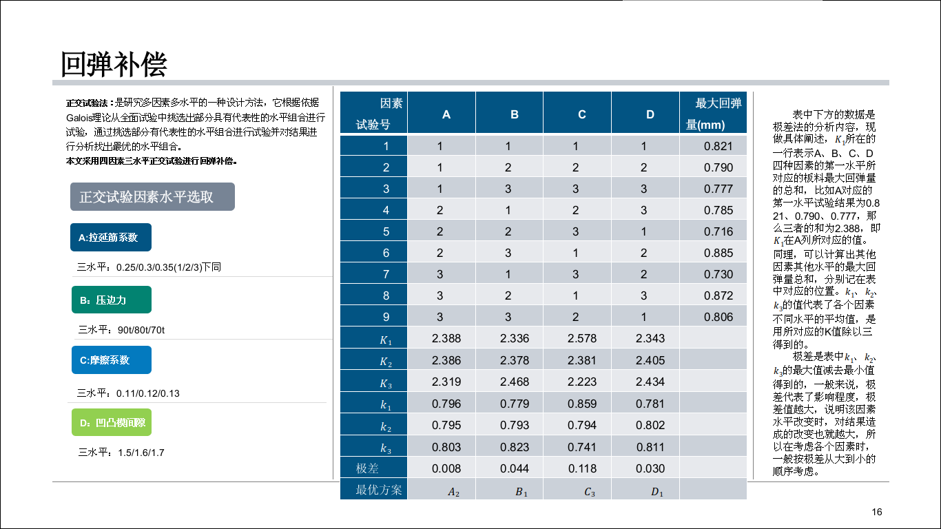 4. 对导入的片体进行了较为完整的冲压成形过程有限元模拟数值分析,分析结果以后,创新性地采用了正交试验法,对选定的工艺参数进行选择和优化,找到使回弹量最小的方案。
