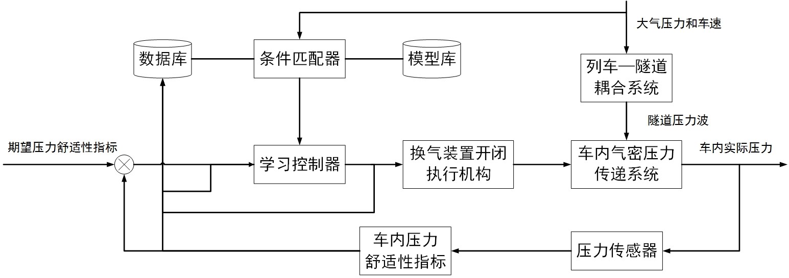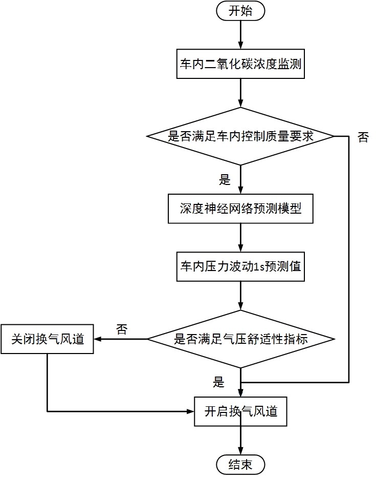 建立了条件与性能相匹配的点对点控制策略。在列车运行过程中,逐点对车内外压力进行测量,输入到深度神经网络模型中获得车内压力波动的1s变化率预测模型,对车内压力波动进行预测,同时,车内二氧化碳浓度进行实时监测,以保证车内新鲜空气量。再根据上述监测量与预测量,对车内换气风道的开闭时刻、开启时间进行控制。