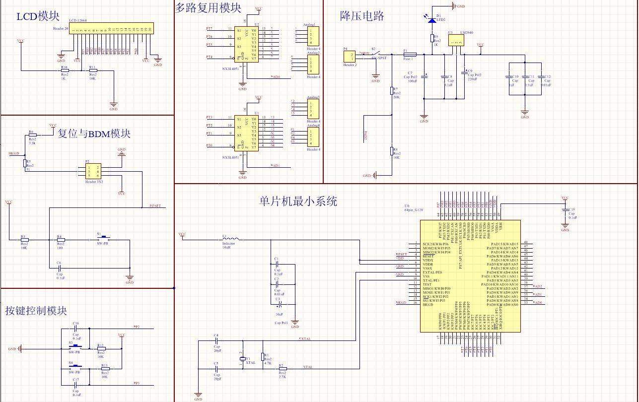 原理图包括为了实现目标功能所需要的电路的设计。由于汽车蓄电池提供的一般是12v的电压,因此需要一个降压电路来将电压降到电路板可以用的5v电压,在这个电路中还引出了LM2940的输入电压到单片机的AD口以便实时的检测供电电压是否正常。将降低后的电压,引入电源供电电路,这个电路上的电容,与电感可以使得输入到单片机的电压与电流更加稳定,波动减小。复位电路的作用是在单片机需要复位时及时的将RESET端口的高电平拉低一段时间这样单片机就能复位重启。复位在调试的时候用到的比较多。BDM电路是飞思卡尔规定的六针脚的端口为主组成的。虽然有六个针脚但是有用的端口只有四个,而且与单片机通信的端口只有一个BKGD端口。复用芯片是8路的模拟量开关,通过S1、S2、S3的值来选择将那一路的模拟量与Z口连接并进一步送到单片机的模数转换端口进而实现一口复用拓展AD口。
