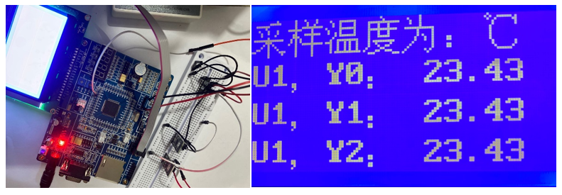 由于目前电路板还没有制作完成,因此只能通过学习板与面包板还有杜邦线手工搭线用来调试程序。目前能够基本实现多路AD的采集与LCD显示,并且能够根据按键控制手动选择要采样的芯片和采样通道。在程序上已经能够基本实现毕设最初所提出的目标功能。