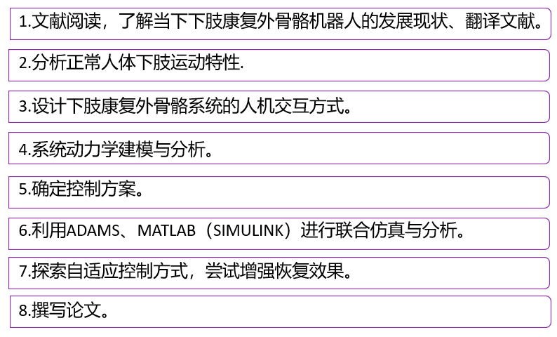 (4)利用ADAMS和MATLAB(SIMULINK)进行建模,并联合仿真,初步得出下肢康复外骨骼系统的训练效果。并继续探索系统的改进和优化。在此基础上完成60%的论文撰写工作。
