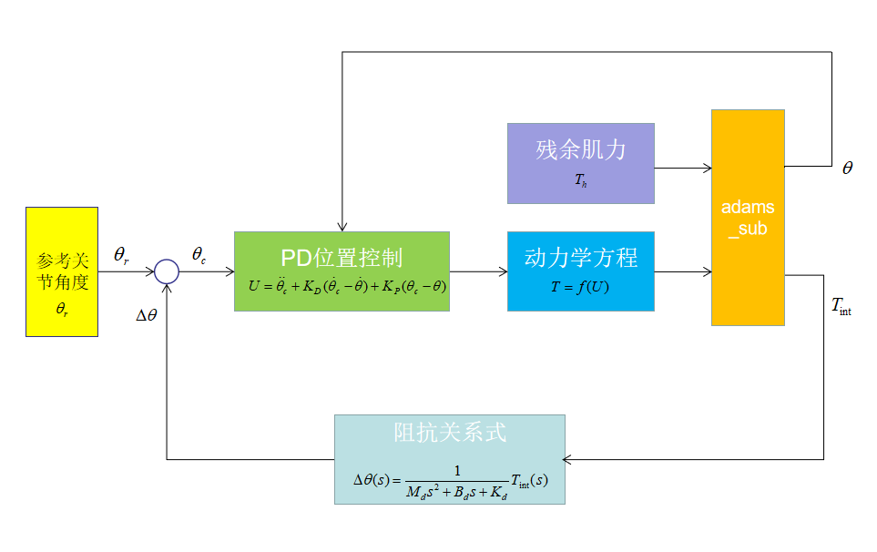 (3)对下肢康复外骨骼系统进行动力学建模和分析,利用拉格朗日法求解系统动力学方程,解出外骨骼机器人关节驱动力矩的关系式,并在内层控制中添加PD控制器,控制关节角度变化。同时完善下肢康复外骨骼系统的控制方案,采用层次化的控制结构,将阻抗控制设置为外层控制,完成基于位置的阻抗控制策略。