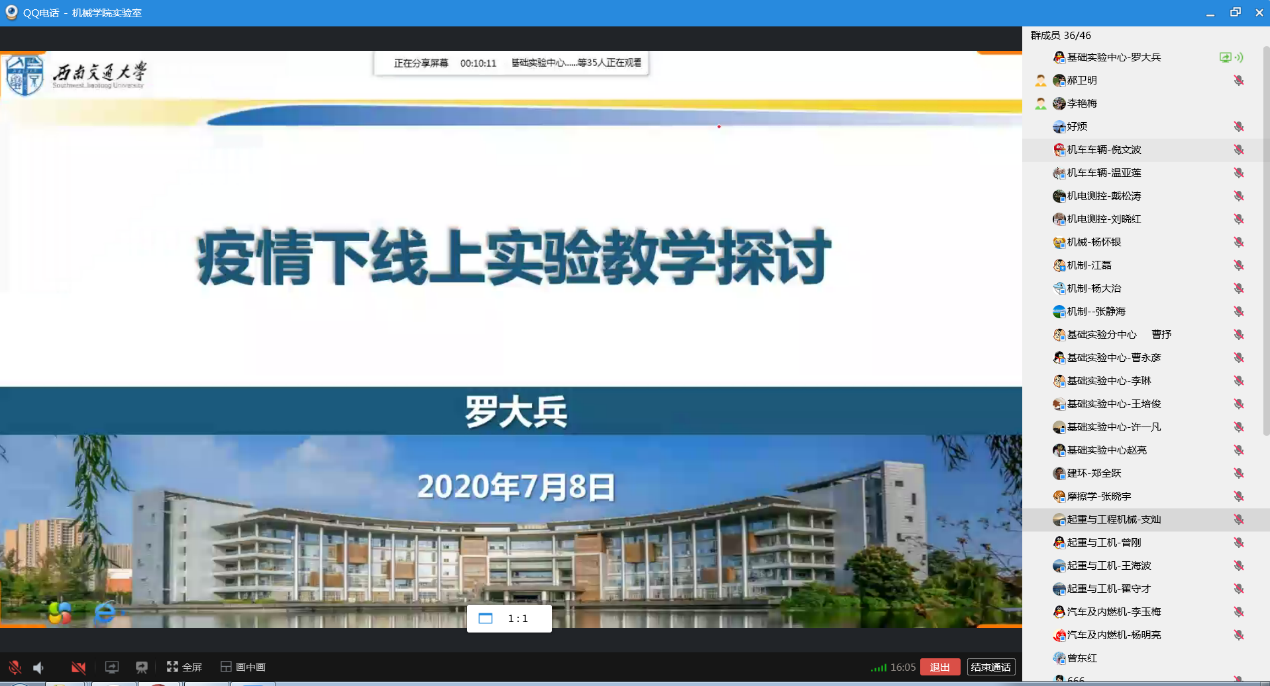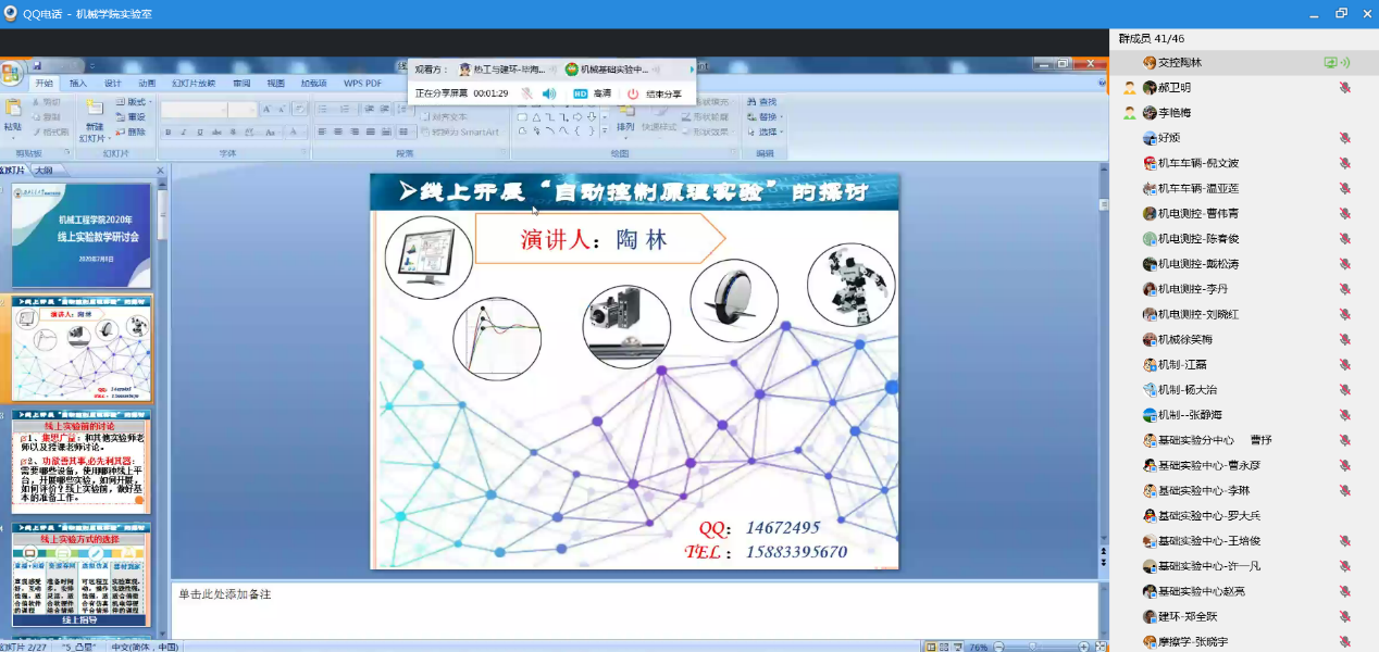 会议由公司分管实验室教学的曾东红副经理主持,公司教工委副主任、机械设计教研室主任罗大兵在线做了题为《疫情下线上实验教学探讨》的直播报告;接着,交控系实验师陶林结合“自动控制原理实验”在线分享了自己在线开展实验教学的经验和体会。