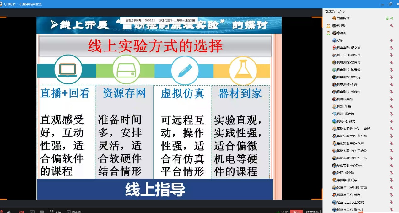 在认真听取了两位老师做的直播报告后,与会40多位老师就在线实验教学的方式、平台等进行研讨交流,大家纷纷提问,两位老师热情答复指导。与会人员表示本次线上研讨会受益颇丰,不仅从两位老师的在线报告中学习到了很多在线实验教学的经验和业务技能,同时也增强了大家积极探索并实践线上实验教学,保障实验室教学质量的信心。
