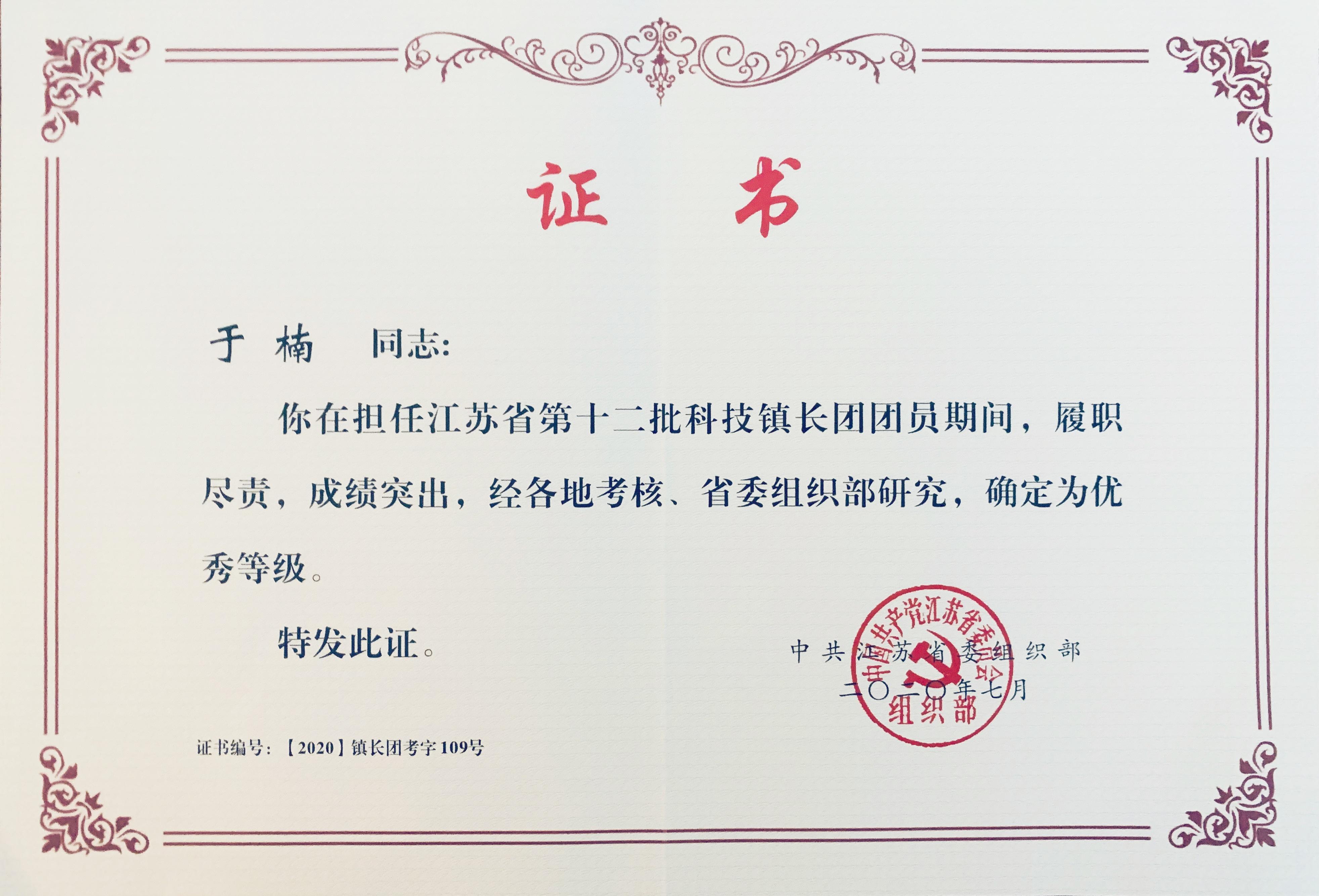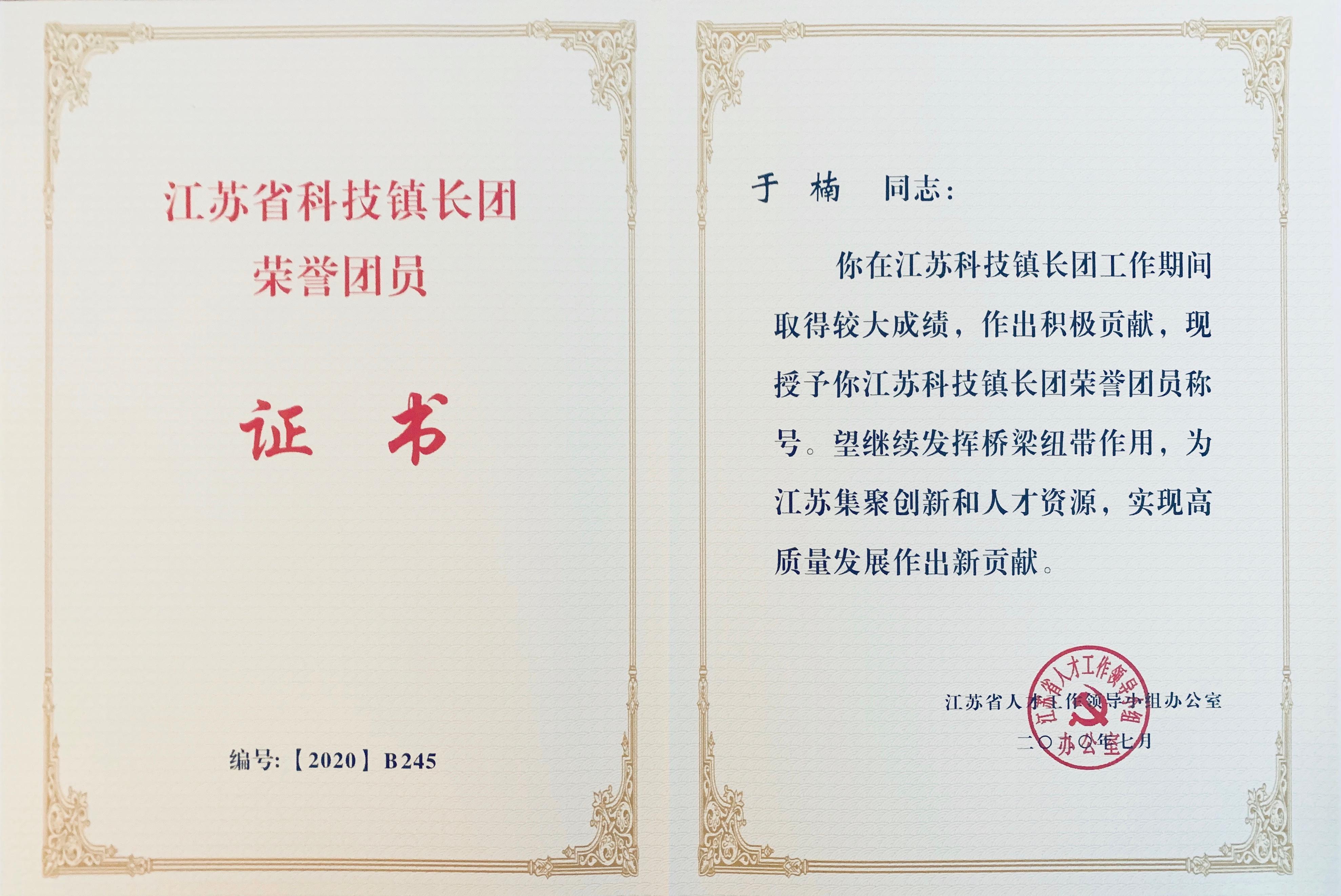 公司于楠老师荣获江苏省科技镇长团省级优秀及“荣誉团员”称号