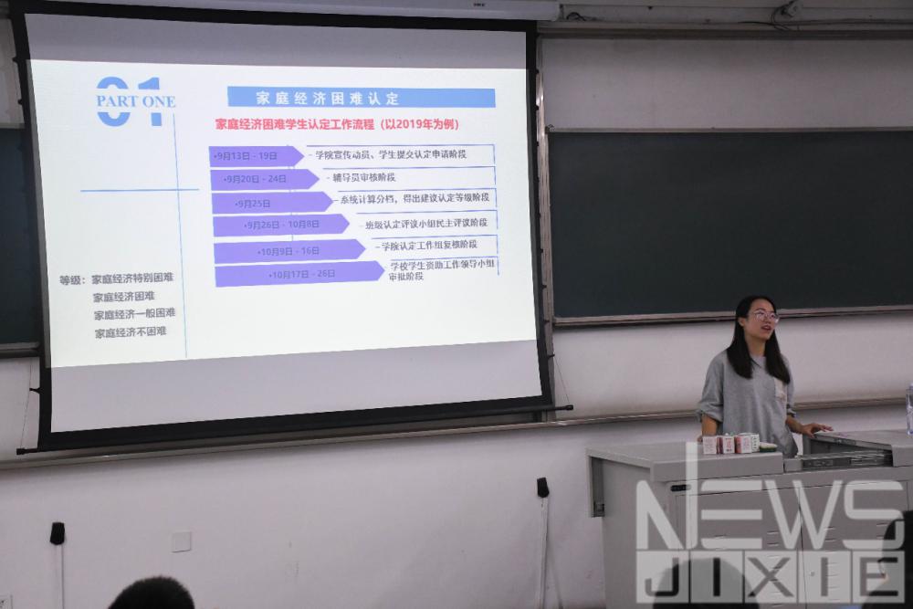9月21日晚6时,2020年388vip太阳集团新生入学教育资助专题讲座在X2218教室举行。本次讲座由机械公司员工工作组廖思璐老师向机械公司2020级新生介绍有关家庭经济困难认定、各类奖学金、助学金以及助学贷款的相关政策。