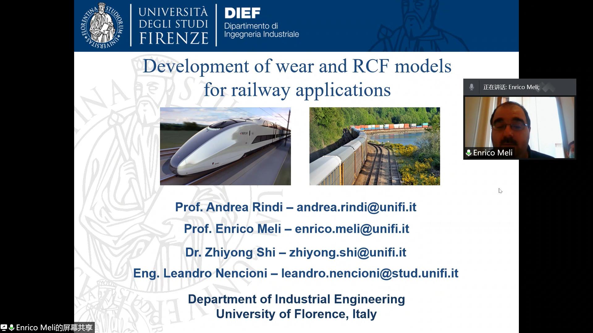 在公司王文健研究员的邀请下,意大利佛罗伦萨大学Enrico Meli副教授,于2021年7月15日晚上20:00-21:30,围绕“ Development of wear and RCF models for railway applications ”内容进行了线上报告。