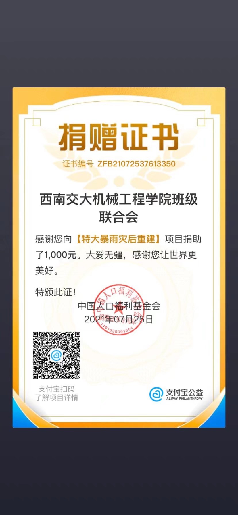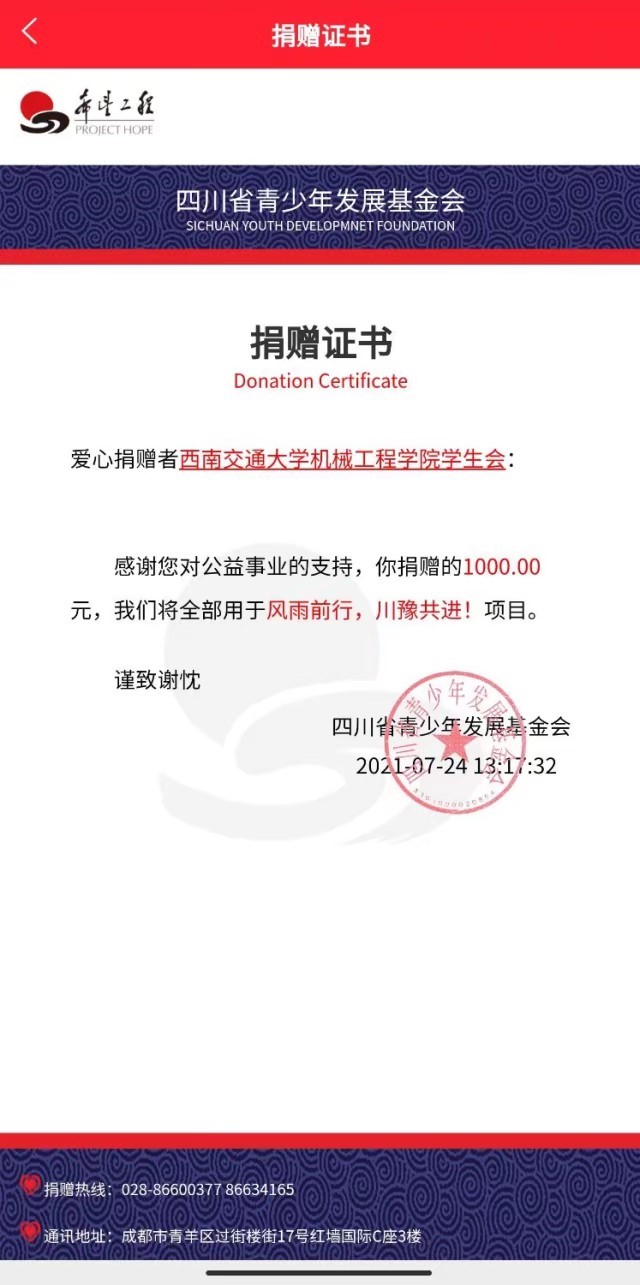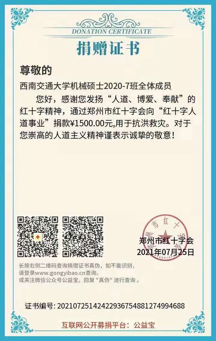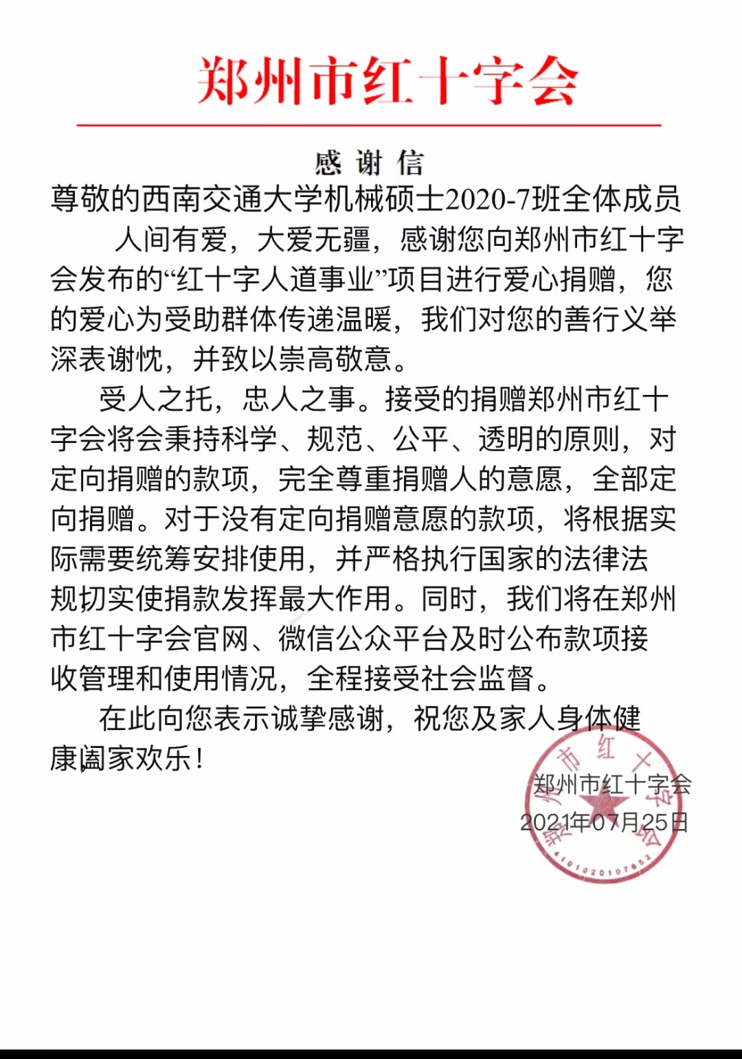 公司团学组织及公司各班级同样重视此次灾情,各团学组织及班级都在积极关心并援助河南。其中388vip太阳集团员工会,388vip太阳集团班级联合会各捐款人民币1000元,机械硕士2020-07班捐款人民币1500元。