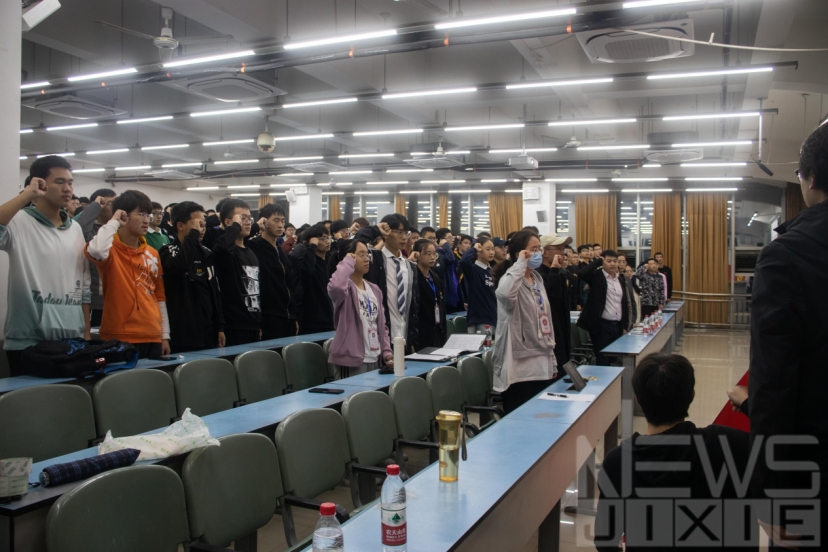 仪式开始,同学们在主持人带领下进行入团宣誓并跟随主持人一同唱起中国共青团团歌。随着歌声停止,辅导员老师们为员工代表佩带团徽。