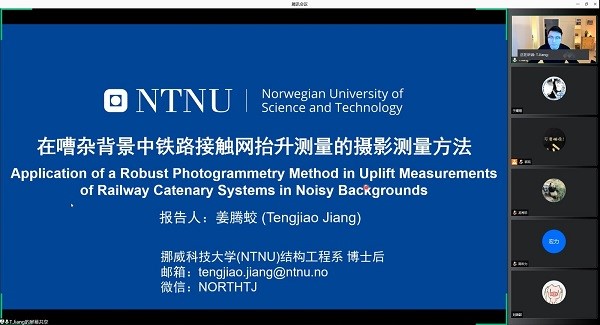 姜腾蛟学者向青年学者们介绍了一种用于电气化铁路便携式摄影测量系统,以实现远程、非接触和无需标记点的接触网抬升测量。该测量系统已成功应用到挪威铁路的接触网抬升测量中。通过数值实验、接触网的现场抬升测量和不同嘈杂背景中接触线的识别,证明了所提出的测量系统的准确性、鲁棒性和适用性。