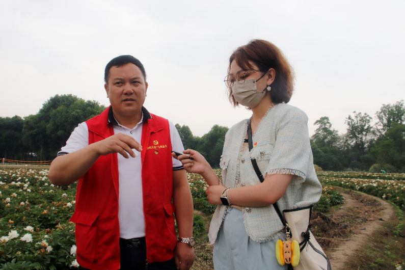 到达芍药花田后,新都区军屯镇护国村党委书记刘春与全体同志分享了护国村的发展历程。他讲到,作为一个传统农业村,护国村地理位置偏僻,常被群众叫做“新都的西藏”,基础设施普遍薄弱,招商引资难度较大,发展起步较为困难,集体经济收入主要来源于土地租金。2019年以前,护国村以传统农业为主,发展模式单一,产业项目匮乏,发展思路僵化,缺乏对可持续发展道路、模式、产业的思考和探索,持续造血能力严重不足。2019年,村“两委”干部充分调研走访后,学习了解到芍药不仅观赏性强,且药食同源,具有极高的价值。在确认护国村地理位置及土壤条件适合种植芍药后,村“两委”干部带头成立乡约合作社,探索特色种植、旅游观光为一体的农旅融合发展模式,以带动全村人民致富,发展壮大集体经济。