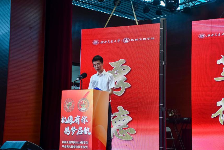 吴海峰先生作为毕业生家长代表进行了发言,他从家长的角度分享了今日的喜悦和对毕业学子的祝福与期盼。他提到,无论大家是否还在轨道交通行业继续耕耘、深造,他都会送上最真挚的祝福。祖国处处是沃土,无论扎根在哪里,只要秉承着交大精神,踏实、用心、都会根深叶茂,都能荫泽四方。