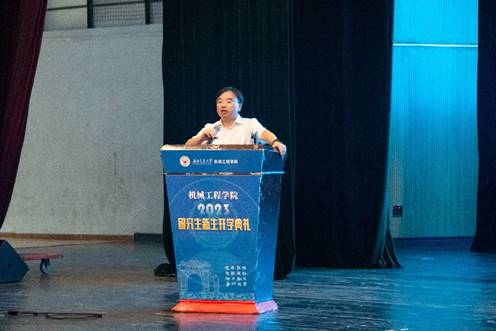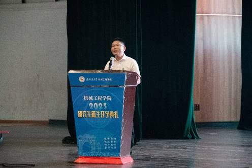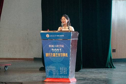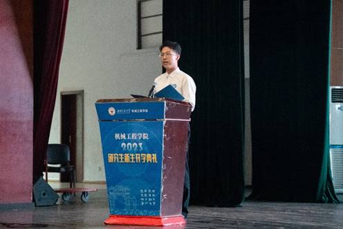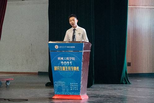大会第五项:2023级博士生刘亚磊同学作为新生代表进行了发言。刘亚磊同学回顾了自己的经历,建议所有研究生一起树立起家国情怀,把“到祖国最需要的地方去”作为自己的价值追求,把“把论文写在祖国大地上”作为自己的科研理想。同时,他建议所有研究生一起秉持“厚德笃行,精勤致远”的机械精神,共同奋斗,共同进步,继续书写交大机械新百年的辉煌。