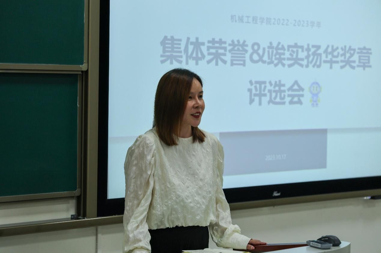 2023年10月17日晚19:15,2022-2023学年集体荣誉和竢实扬华奖章的答辩评审会于X30610准时举行。参加这次活动的评委老师有机械工程公司党委副书记沙晓雪,导师代表宋兴国、张玲玲,以及研究生、本科各年级辅导员老师。本次答辩主持人章翊骅。