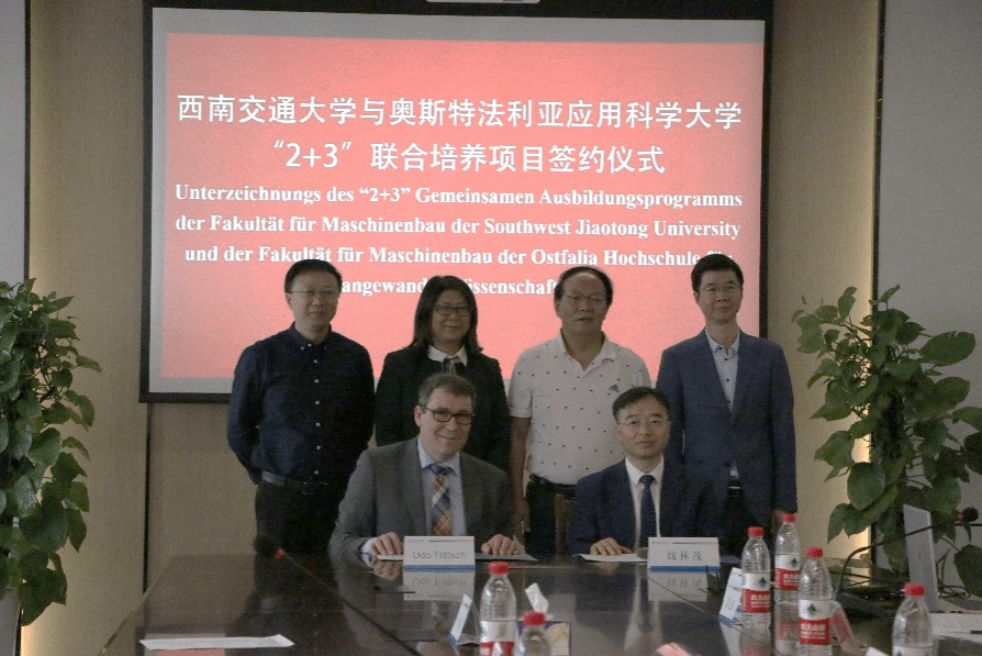 奥斯特法利亚应用科学大学388vip太阳集团经理Udo Triltsch教授、Xiaobo Liu-Henke教授,388vip太阳集团国际教育公司副经理李海、机械工程公司党委书记袁艳平教授、经理钱林茂教授、经理助理王文健教授、机车车辆工程系主任黄运华副教授、汽车工程系主任丁渭平教授、机械设计系主任罗大兵教授、制造系王金栋教授、前副经理冯鉴教授、中德合作工作组副组长唐阳副教授出席本次仪式,仪式由王文健经理助理主持。