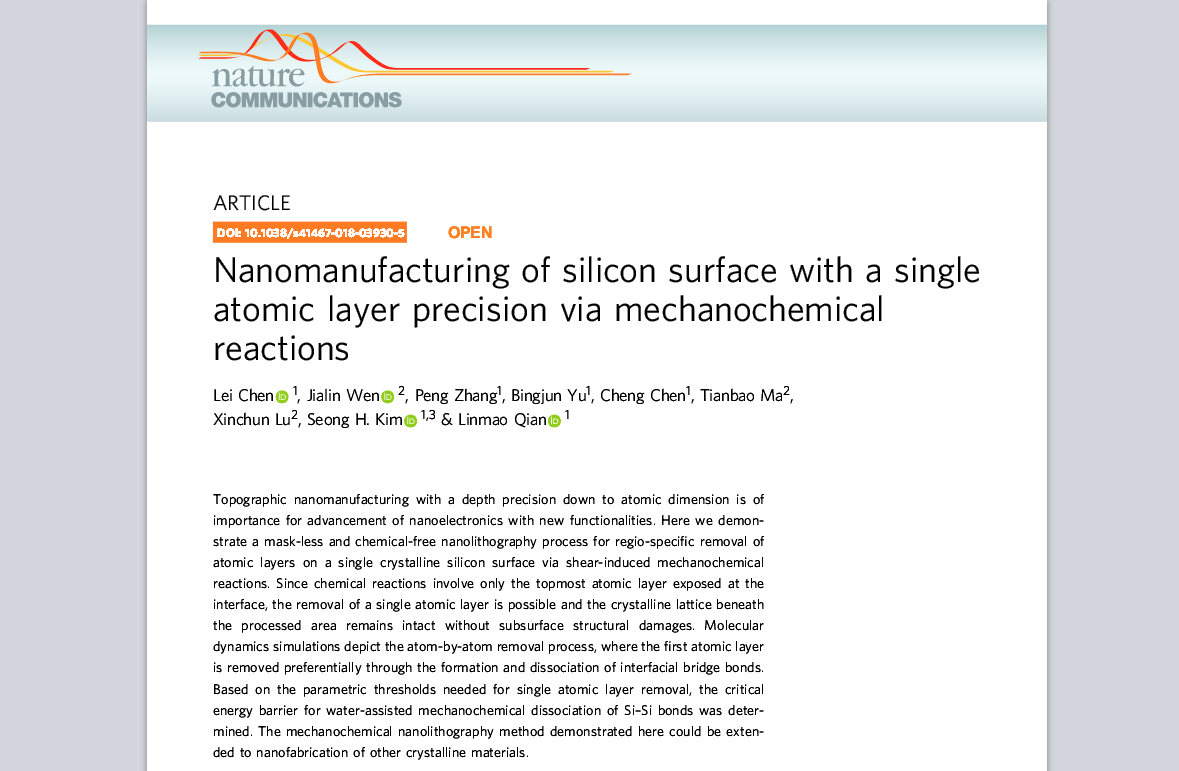 近日,公司388vip太阳集团摩擦学研究所超精密表面制造团队以388vip太阳集团为第一通讯作者单位,与清华大学摩擦学国家重点实验室团队合作,在Nature子刊Nature Communications上撰文报道了半导体晶圆材料的极限加工研究进展,实现了单层硅原子的可控去除。这是以388vip太阳集团为主导,在该杂志发表的首篇论文。该论文的第一作者为公司388vip太阳集团陈磊副研究员,共同通讯作者为公司388vip太阳集团钱林茂教授,以及清华大学摩擦学国家重点实验室路新春教授。
