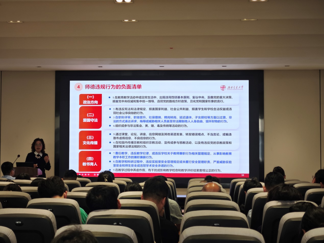 随后,郑江书记重点强调了师德师风建设规范体系,系统梳理了相关制度文件,结合《新时代高校教师职业行为十项准则》和师德违规负面清单,明确了教师行为的“标线”要求。她通过剖析典型案例,警示教职工要远离师德“红线”,并详细说明了违规行为的处理流程及其对个人职业发展的影响。