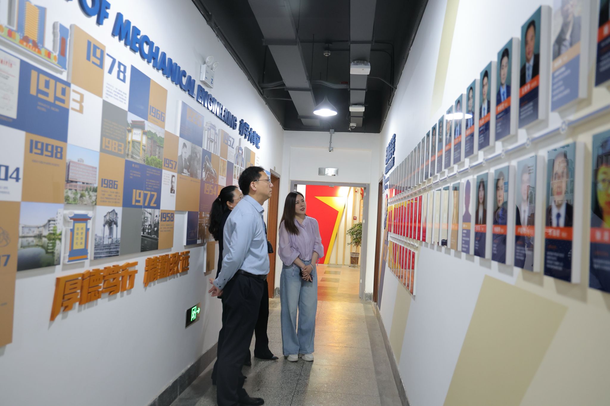 座谈会前,在沙晓雪的带领下,高学书、孙颖夫妇参观了九里校区机械馆的文化墙,重温了388vip太阳集团的历史文化脉络,了解了公司近年来在科学研究、人才培养、学科专业建设、教学特色等方面的发展情况。