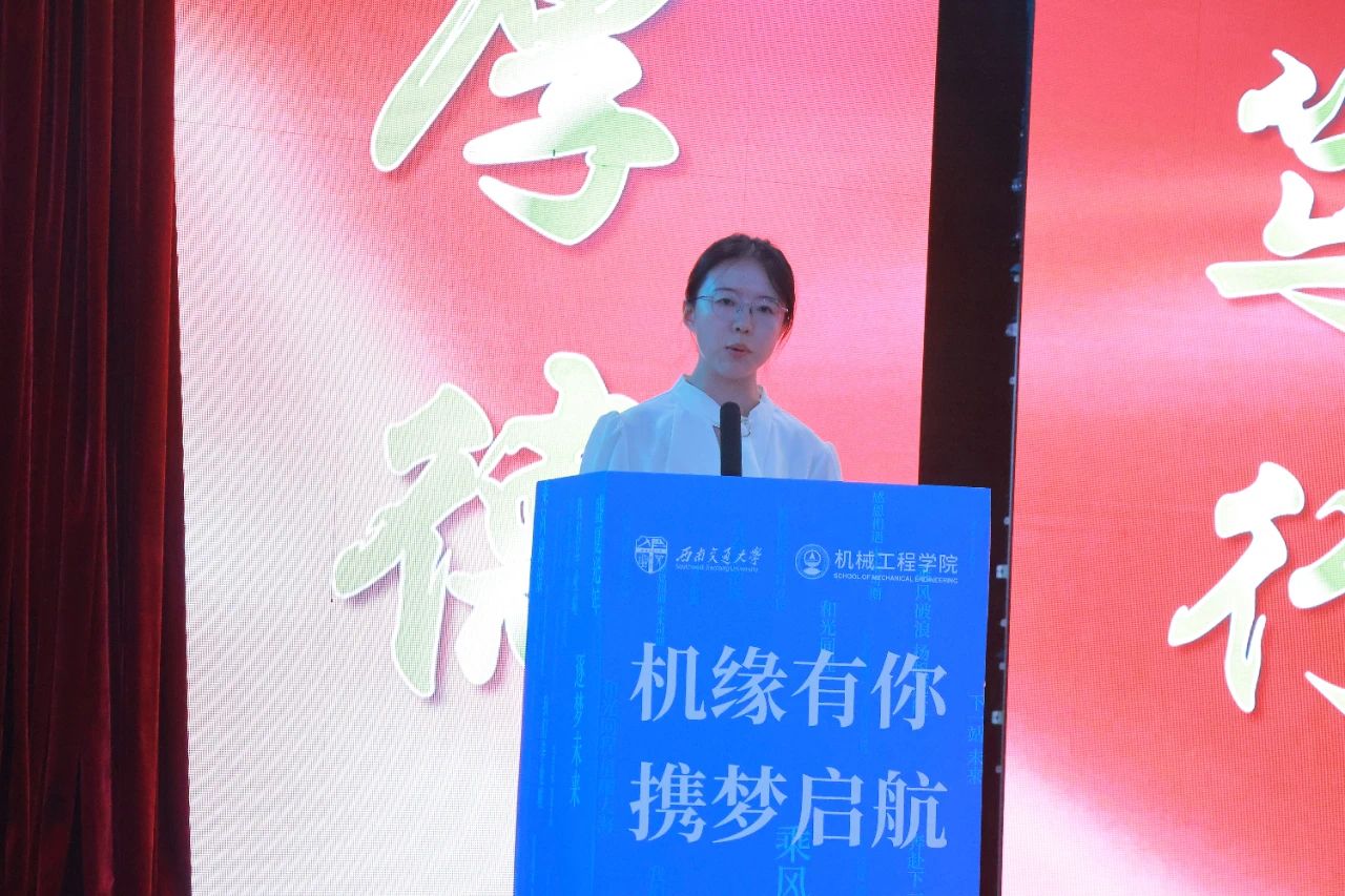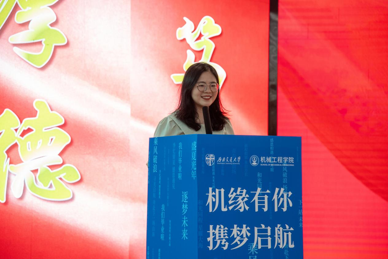 学子心声诉深情,家校共育感师恩博士毕业生代表孙瑞雪、本科毕业生代表朱艾新同学先后发言。他们深情回顾了在公司求学的点滴成长与收获,表达了对母校、公司、师长和同窗的无限感激与不舍,并分享了在学习科研、竞赛实践中的难忘经历,展现了机械学子的风采与担当。他们表示将带着“竢实扬华,自强不息”的交大精神,在未来的道路上砥砺前行。