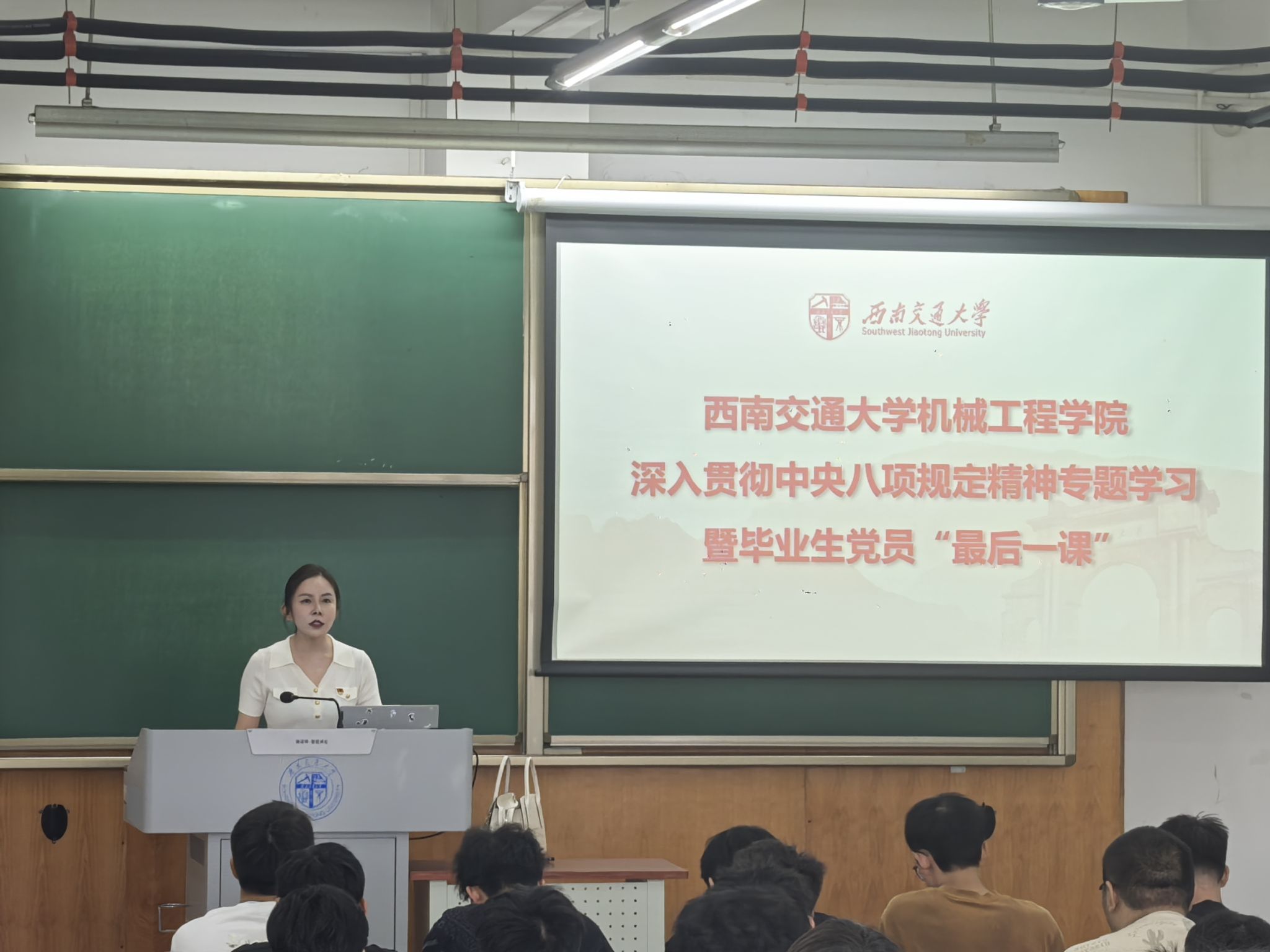 为引导毕业生党员坚定理想信念,筑牢廉洁从业思想根基,6月17日,公司在犀浦校区四号教学楼举办深入贯彻中央八项规定精神学习教育专题党课暨毕业生党员“最后一课”。公司党委副书记沙晓雪担任主讲。
