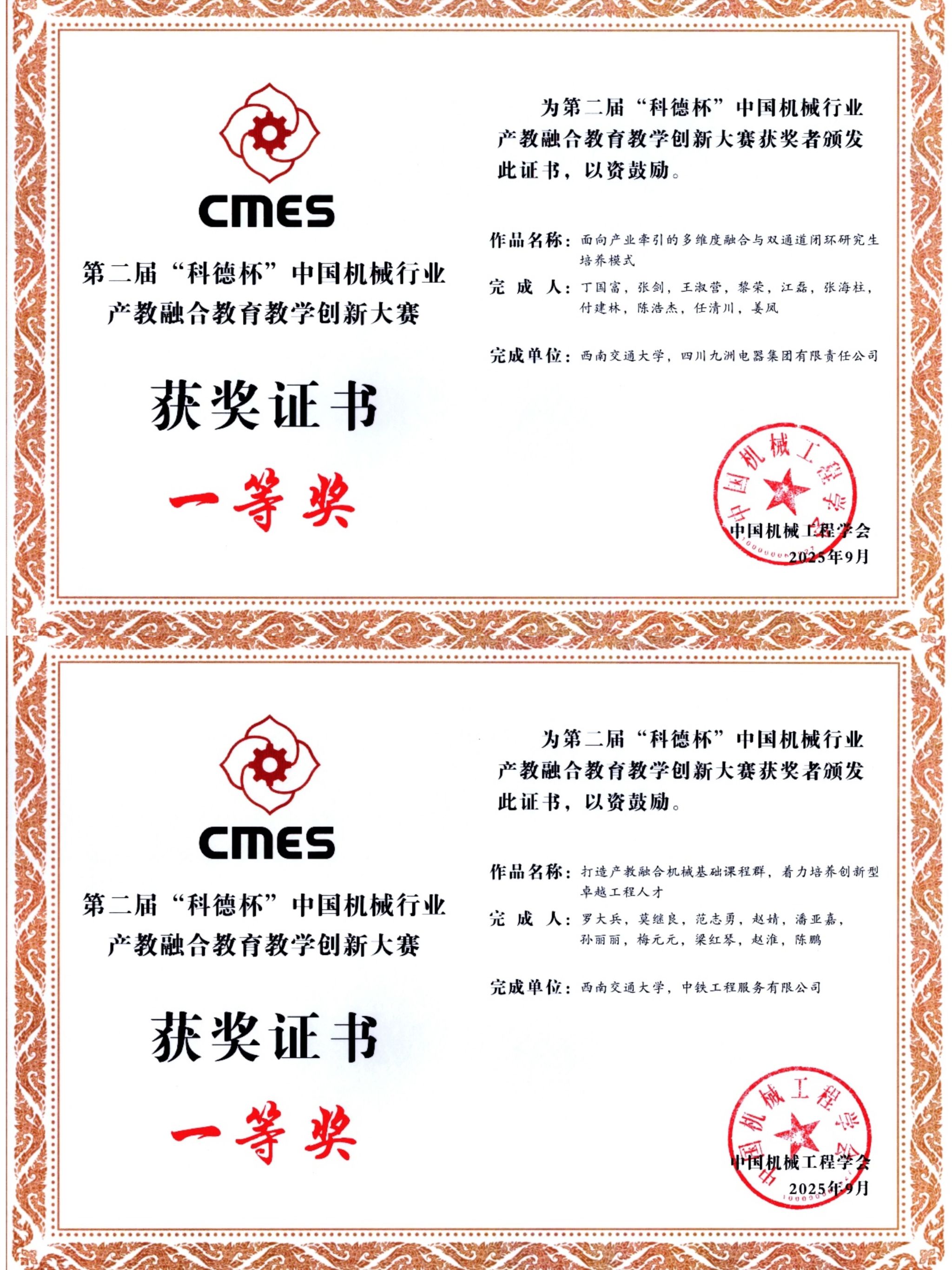 为认真贯彻《教育强国建设规划纲要(2024-2035)》精神,全面落实立德树人根本任务,推动产教融合、科教融汇、职普融通走深走实,加快培育新质生产力,服务经济社会高质量发展,由中国机械工程学会、中国机械行业卓越工程师教育联盟主办的第二届“科德杯”中国机械行业产教融合公司产品创新大赛总决赛在广州举行,公司丁国富教授牵头团队、罗大兵教授牵头团队分别获研究生组、本科生组2项一等奖。