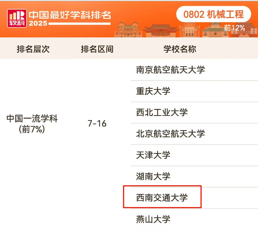 跻身全国前7%(A-序列)!西南交大机械工程学科2025软科排名再进位